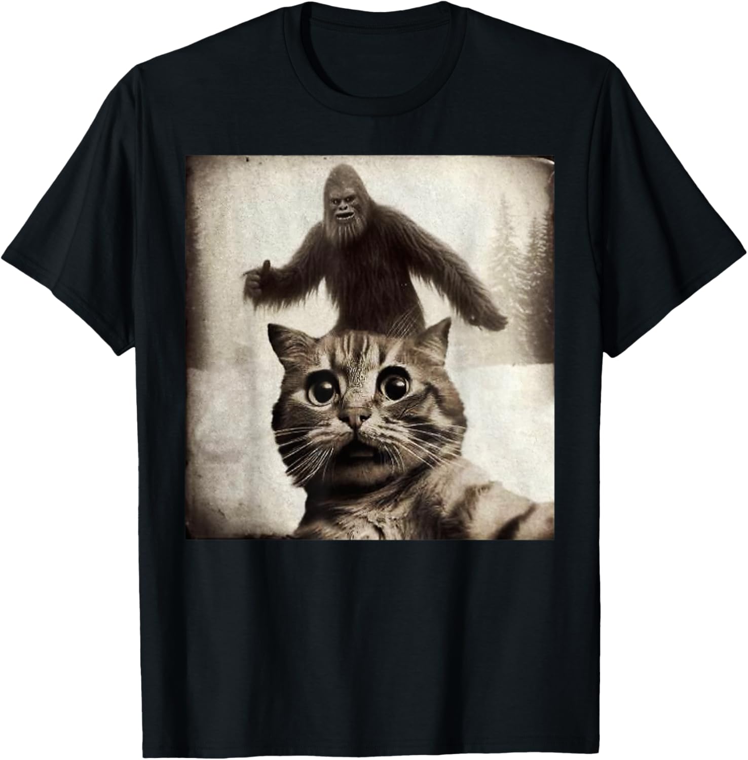 Funny Cat Selfie With Bigfoot Sasquatch Cat Bigfoot Photo T-Shirt