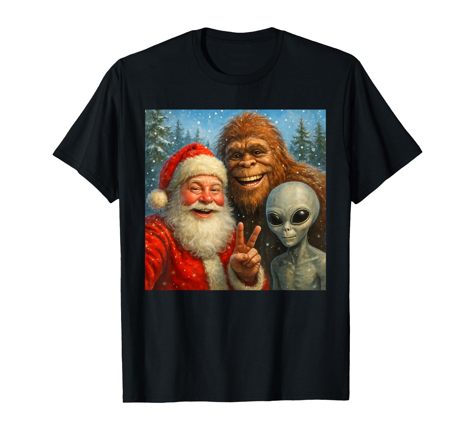Funny Cat Selfie with Santa Claus & Bigfoot Meme T-Shirt