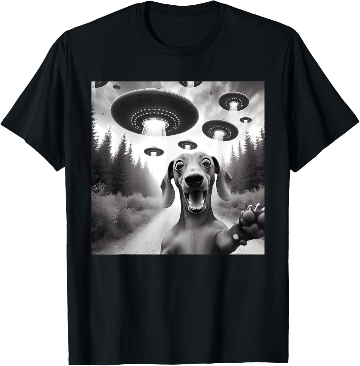 Funny Dachshund Selfie with UFOs Alien Lovers Pet Dog Owners T-Shirt