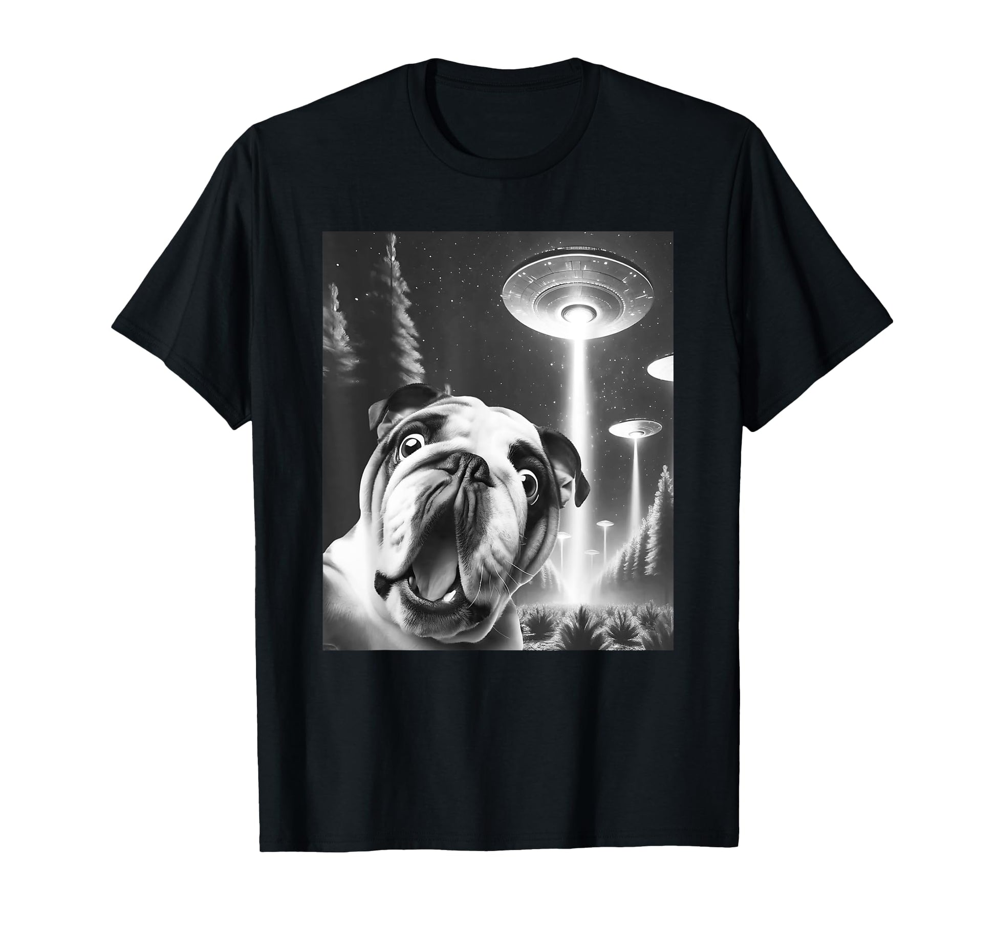 Funny English Bulldog Alien UFO Taking a Selfie Dog Mom Dad T-Shirt