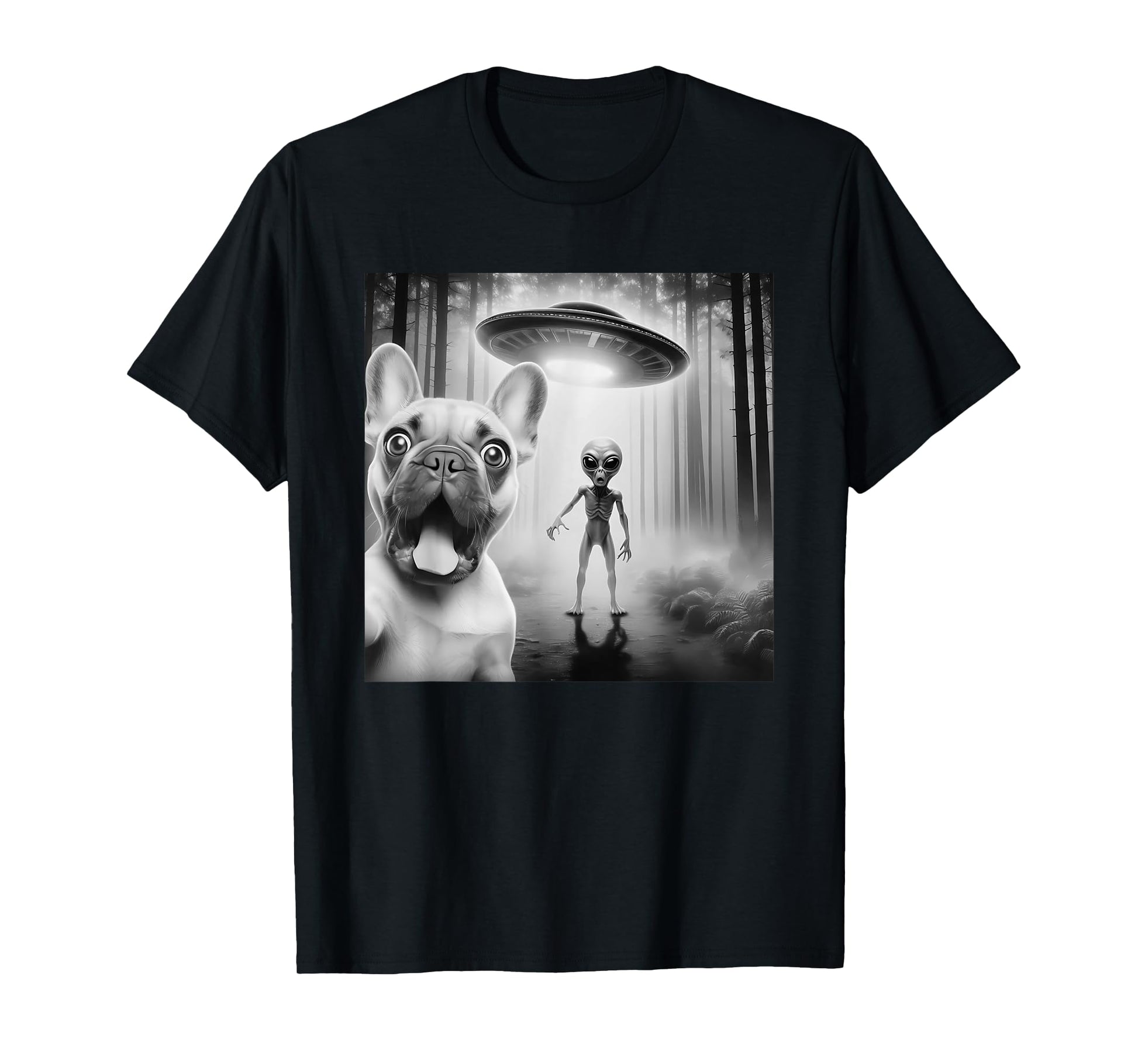 Funny French bulldog surprised Selfie with alien UFO T-Shirt