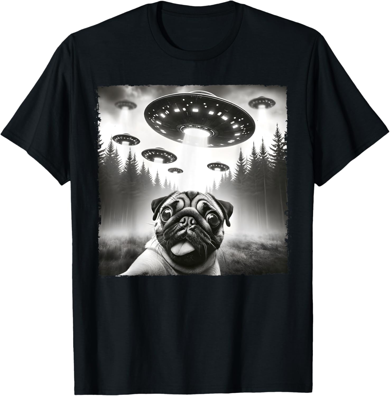 Funny Meme Pug UFO Retro Alien Pug Dog UFO Selfie Invasion T-Shirt