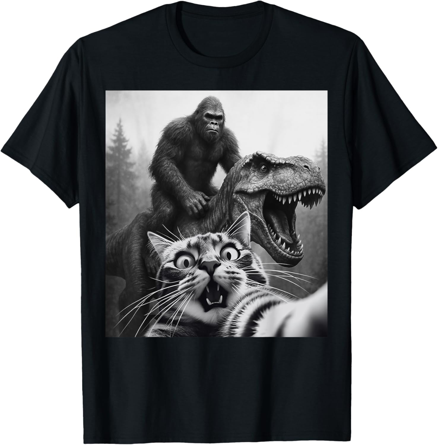 Funny Cat Selfie with Bigfoot Riding Dinosaur T-rex T-Shirt