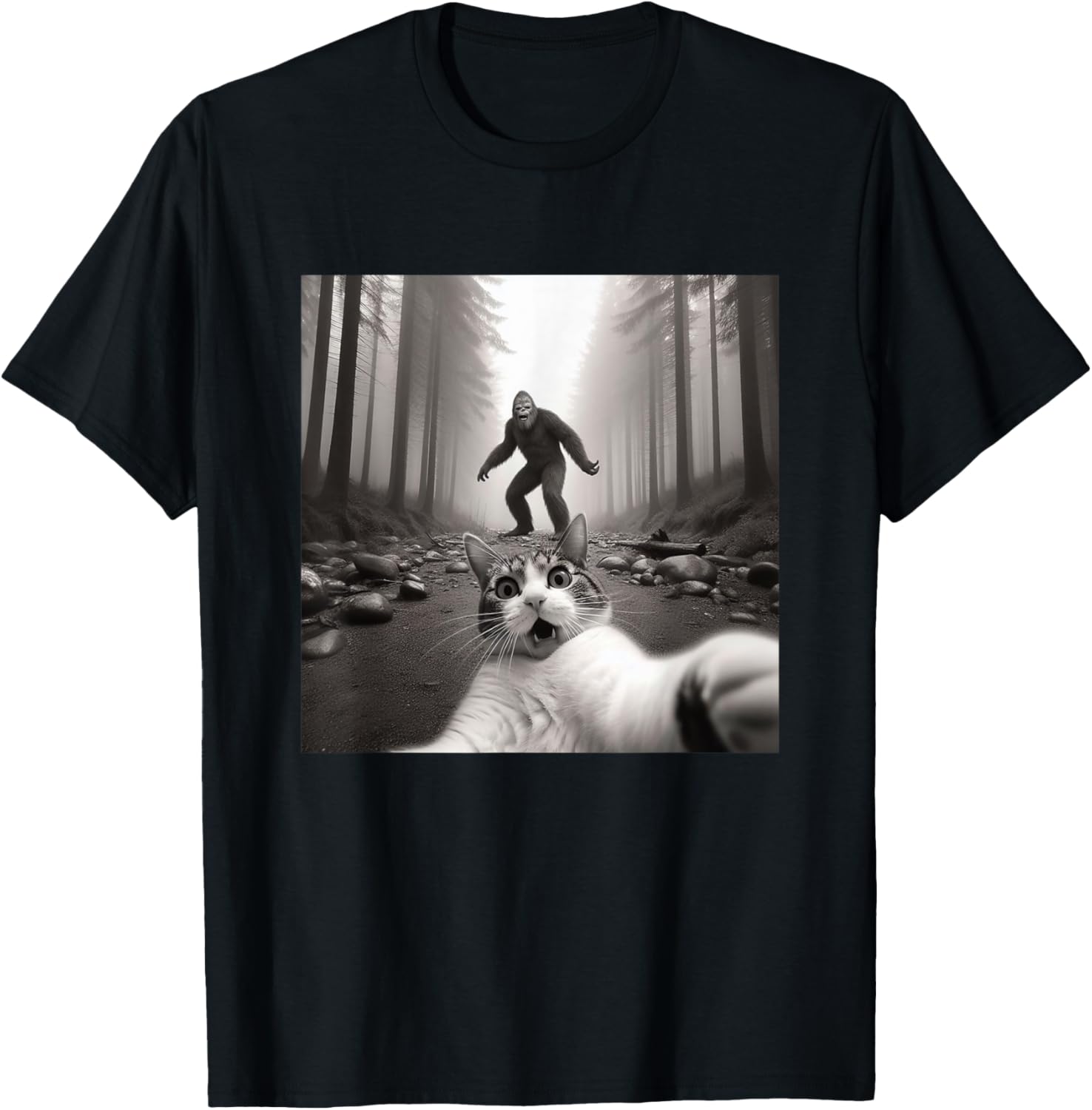 Funny Surprised Scared Cat Selfie With Sasquatsch Bigfoot T-Shirt