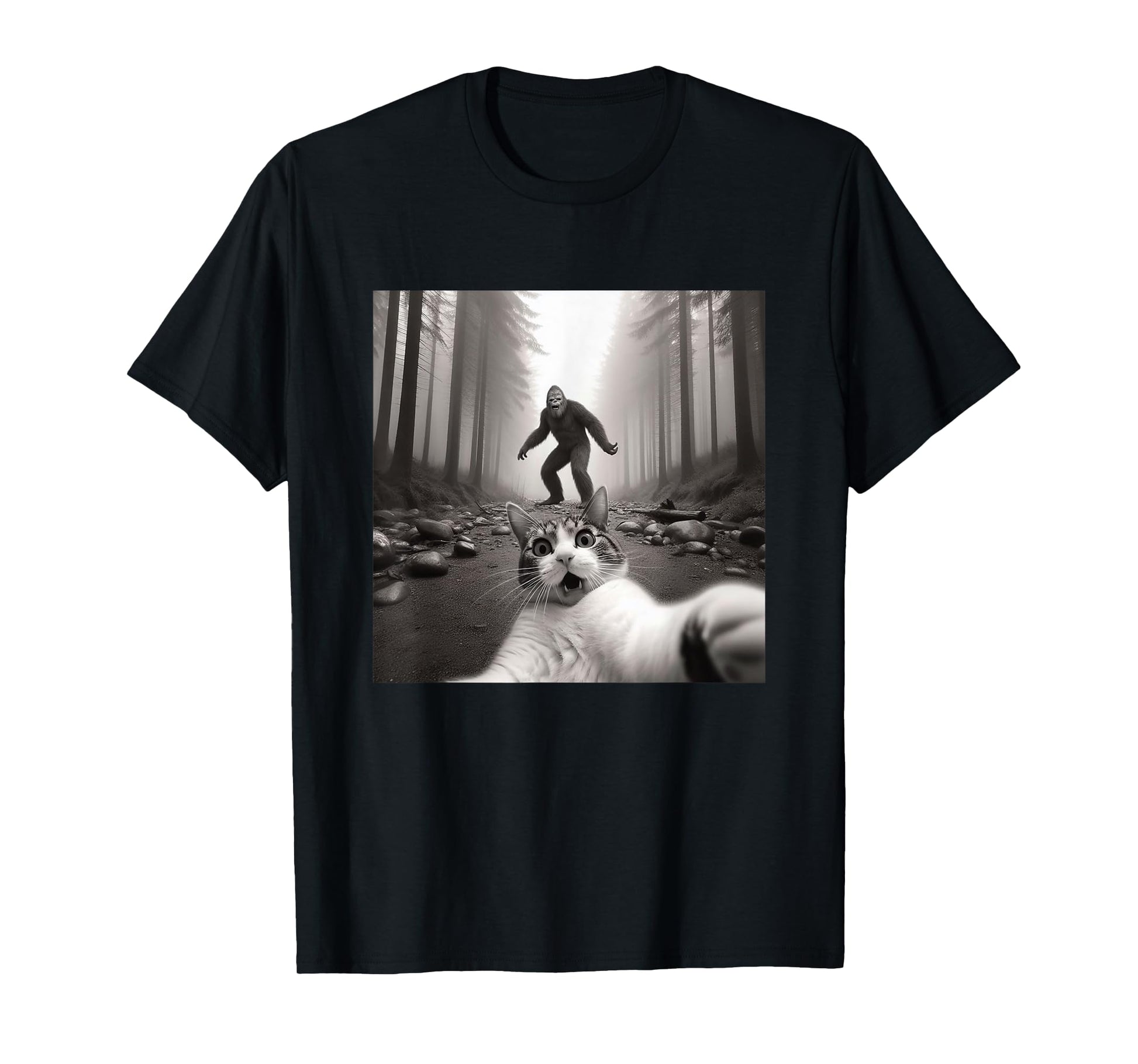 Funny Surprised Scared Cat Selfie With Sasquatsch Bigfoot T-Shirt