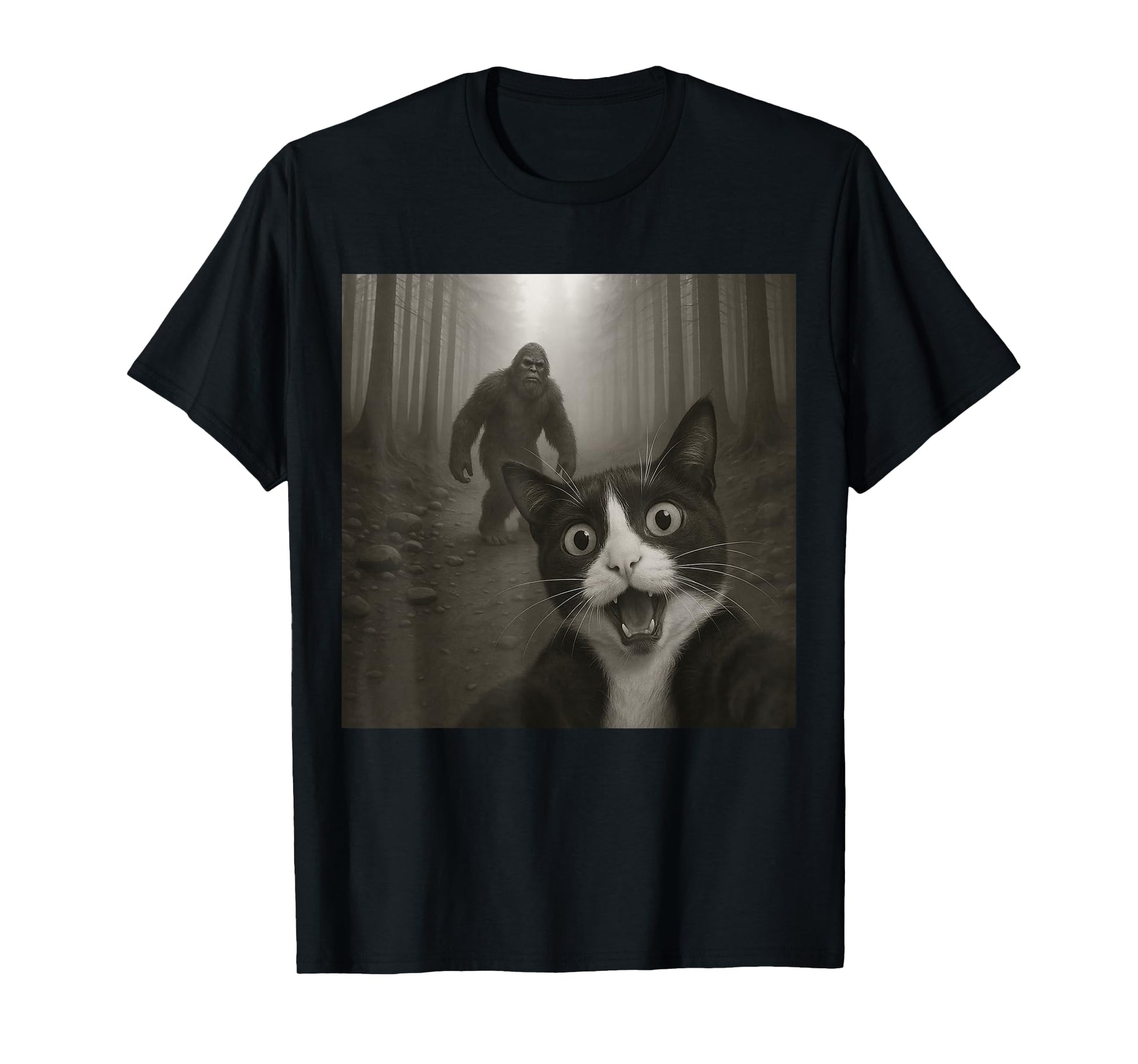 Funny Surprised Scared Tuxedo Cat Selfie With Bigfoot T-Shirt