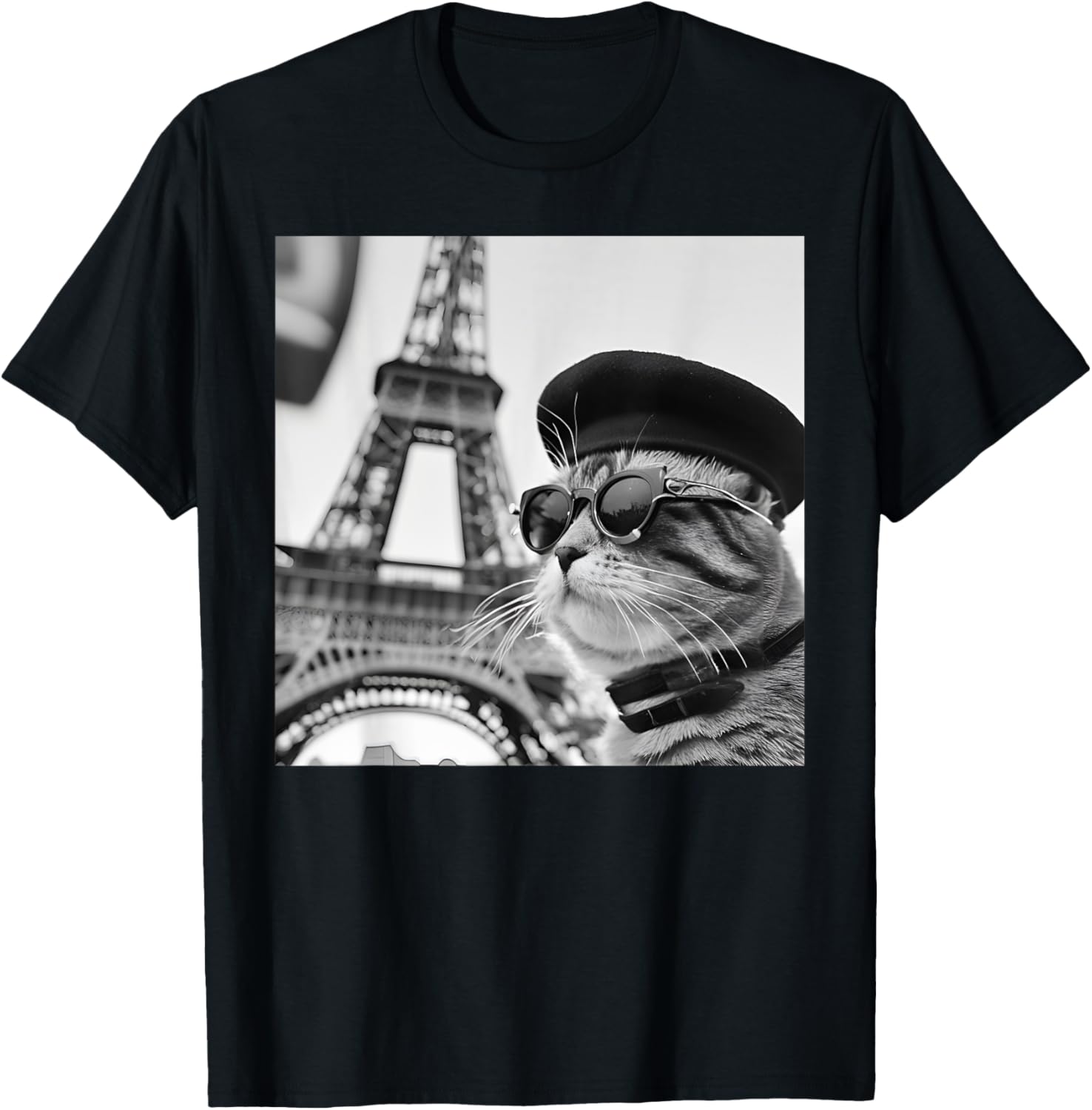 Funny Cat Wearing Sunglasses and A Beret At The Eiffel Tower T-Shirt