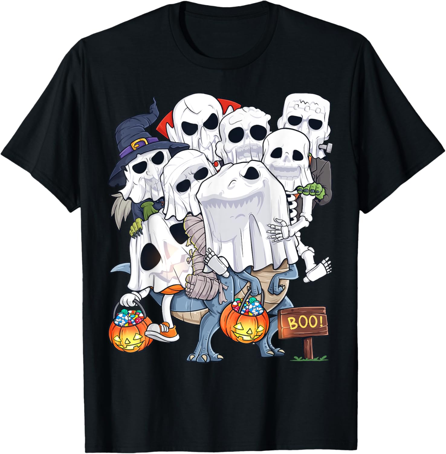 Halloween Skeleton Zombie Riding T Rex Funny Pumpkin Boo T-Shirt