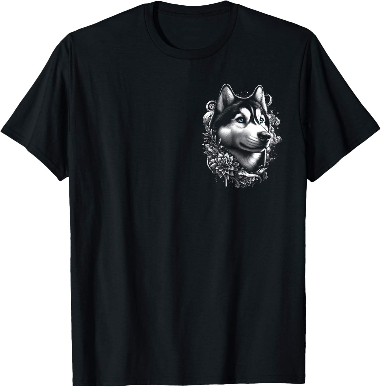 Cool Husky with Blue Eyes and Flowers Decoration on Chest T-Shirt, Small