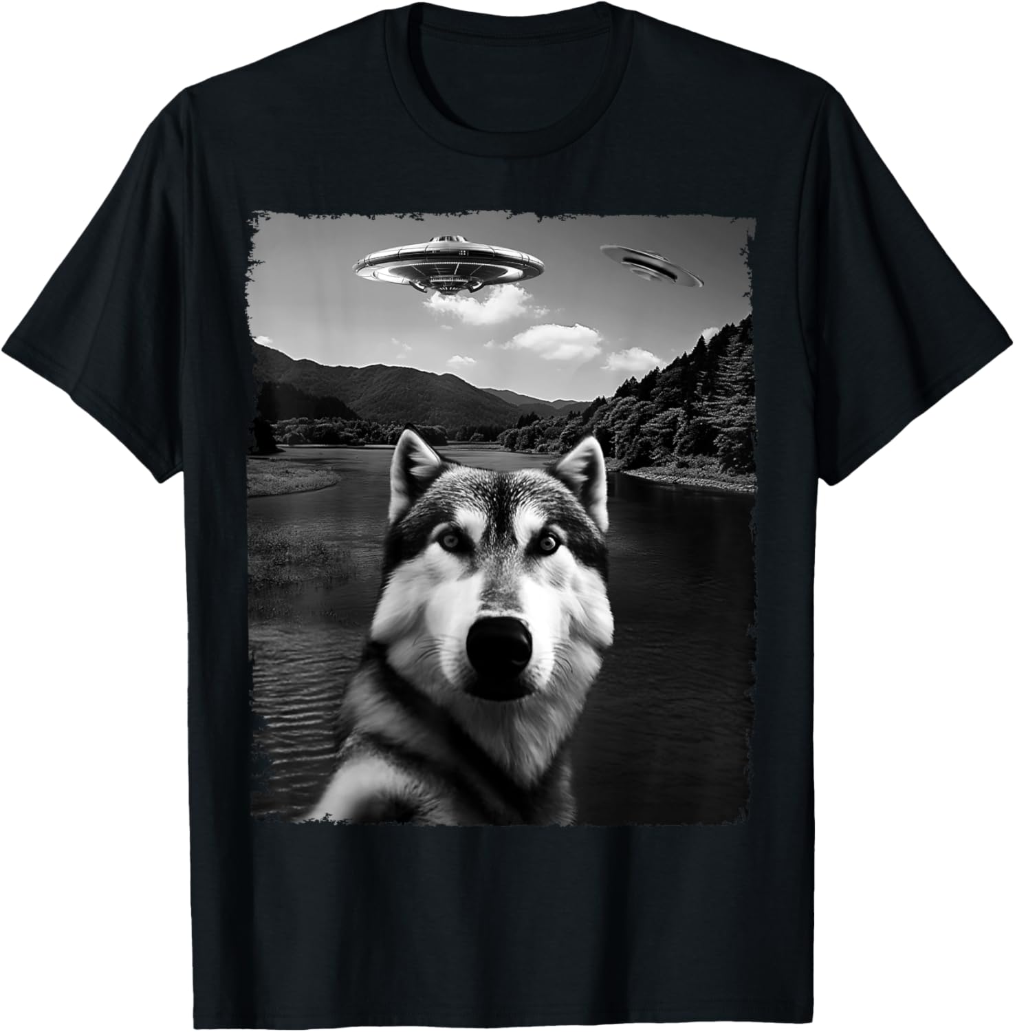 Dog Husky Selfie with Alien and Ufo T-Shirt