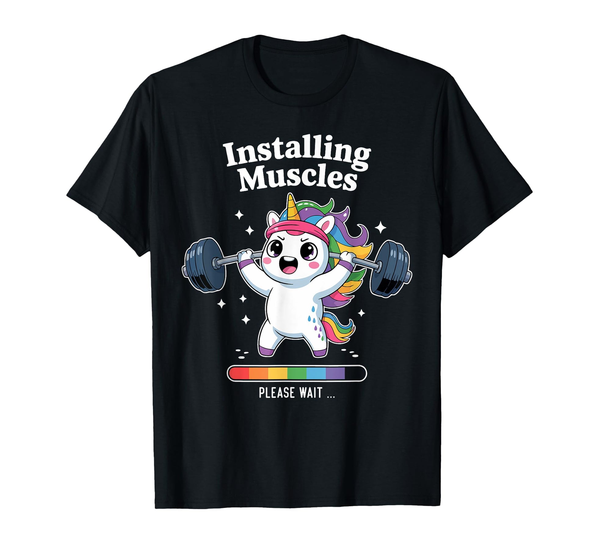 Installing Muscles Please Wait Funny Unicorn Gym Workout T-Shirt