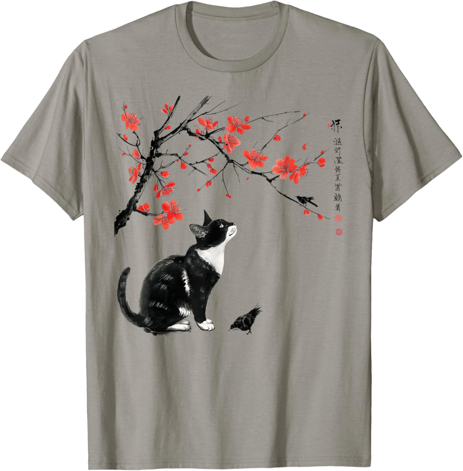 Japanese Nature art: Cat and bird with Cherry Blossom tree T-Shirt