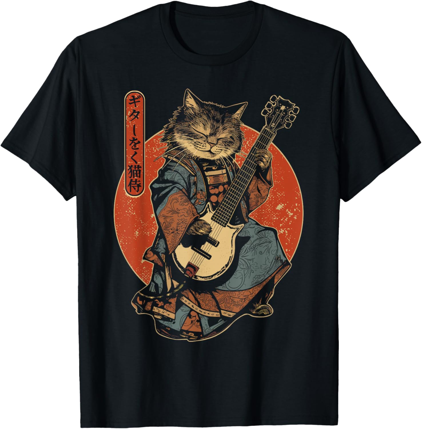 Japanese Samurai Cat Playing The Electric Guitar T-Shirt