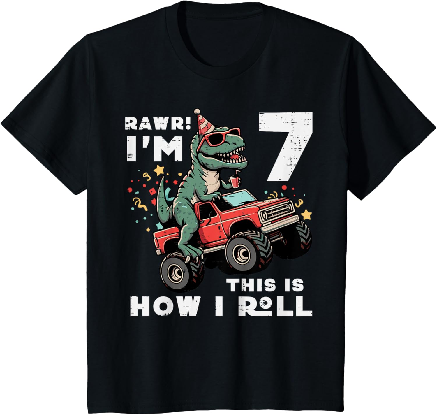 Kids Rawr Im 7 Dino This How I Roll 7th Birthday Trex Bday Boys T-Shirt
