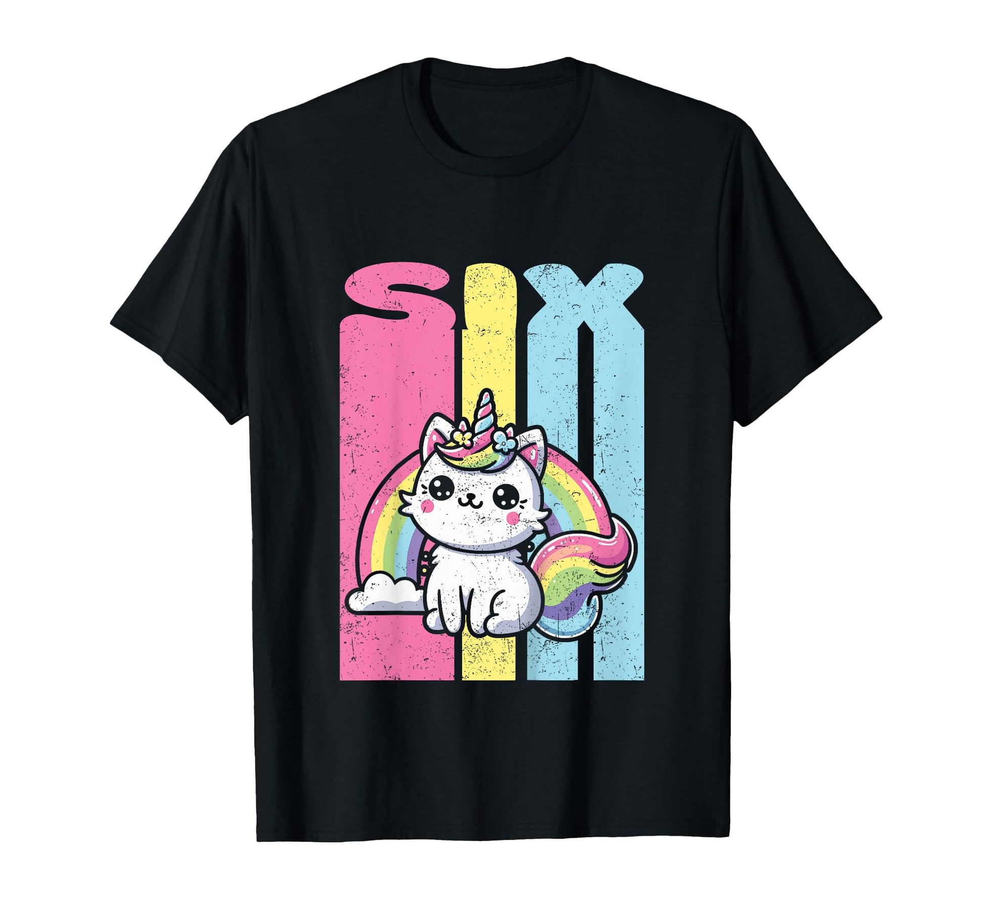 Kids Six 6th Birthday Caticorn Cat Unicorn Rainbow Grunge T-Shirt