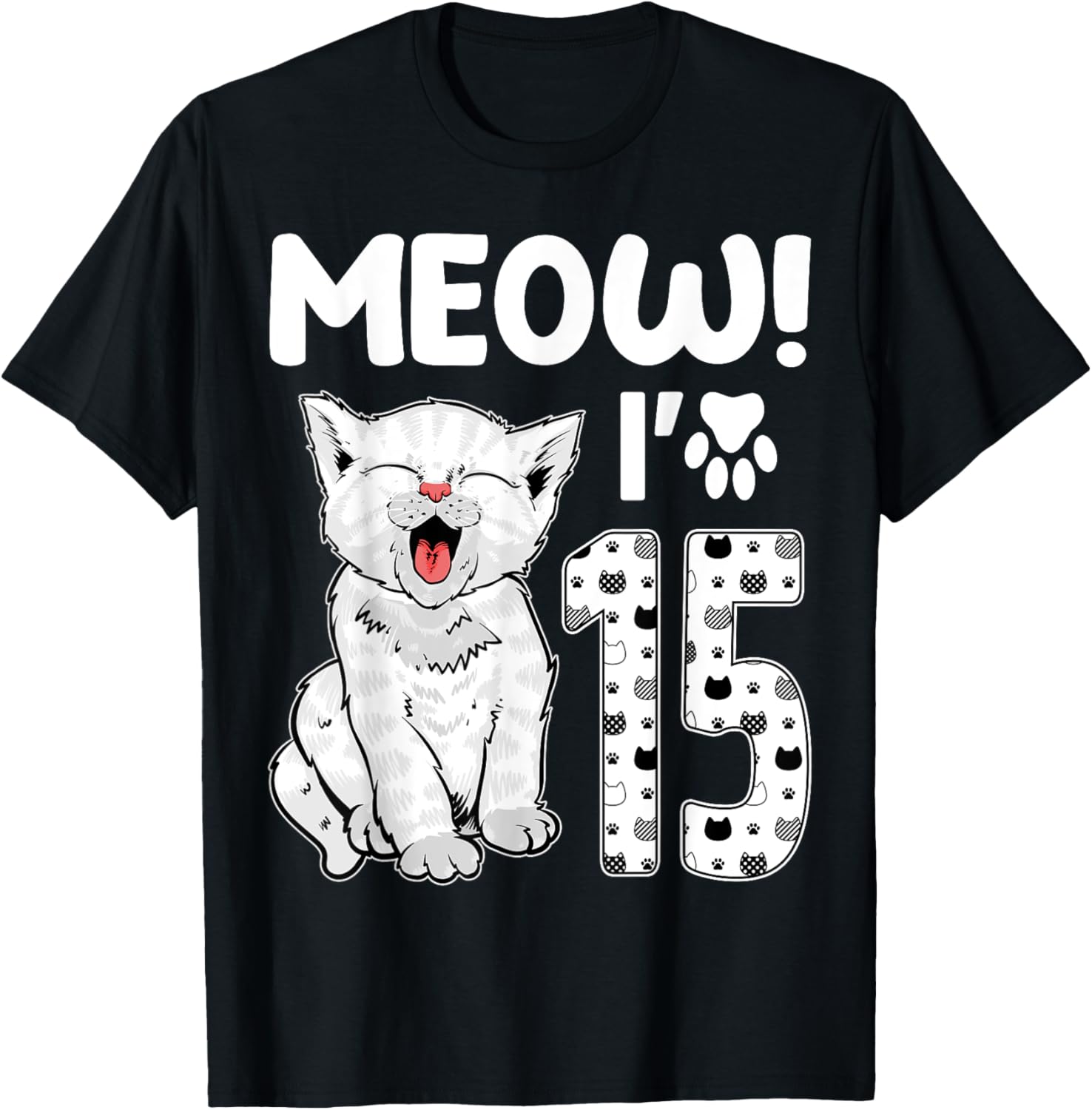 Meow I'm 15 Years Old Girl 15th Birthday Cat Cute Cat Lover T-Shirt