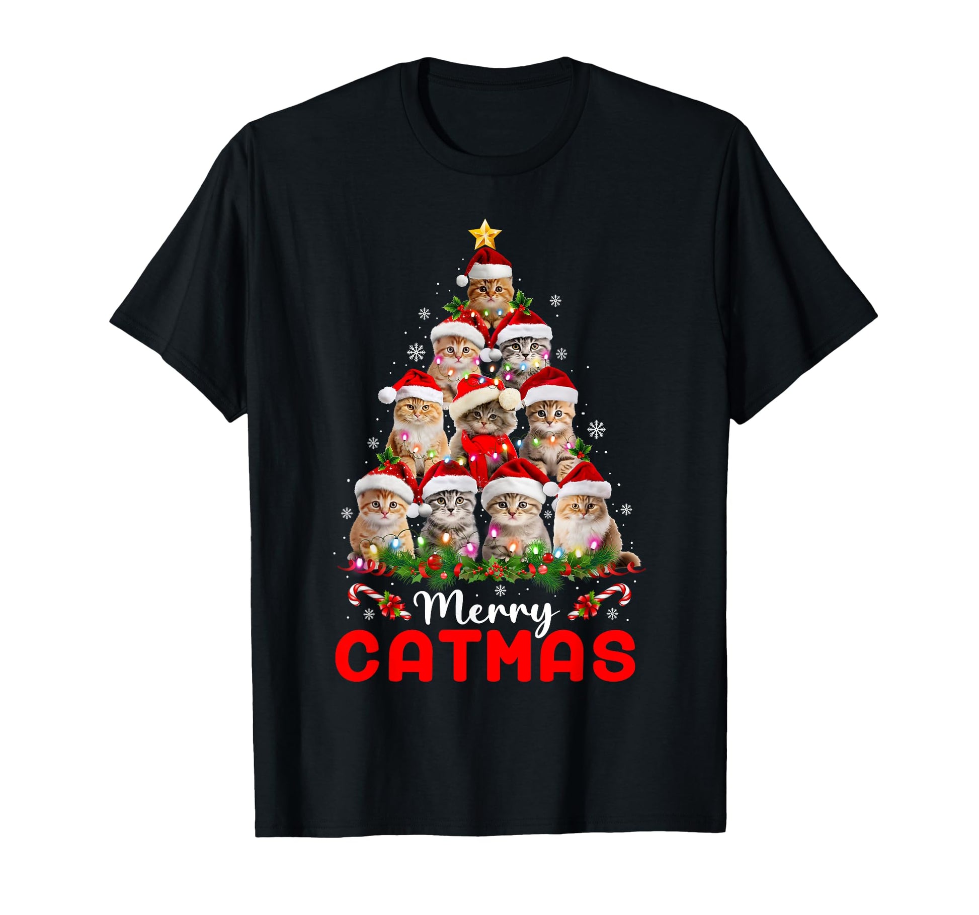 Meowy Catmas Cat Christmas Tree Lights Funny Xmas Pajamas T-Shirt