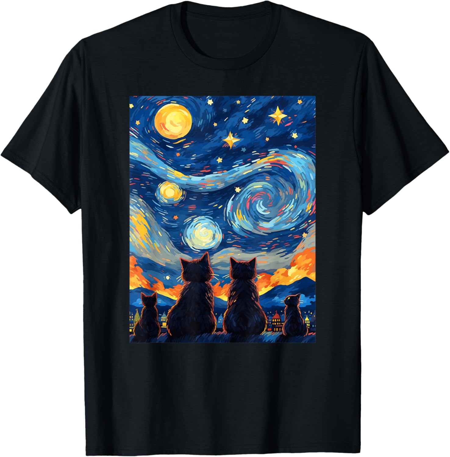 black cats Painting art Starry Night kitty kitten Van Gogh T-Shirt