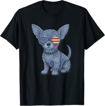 Patriotic Chihuahua with American Flag Sunglasses Denim Dog T-Shirt for Men Women Kids