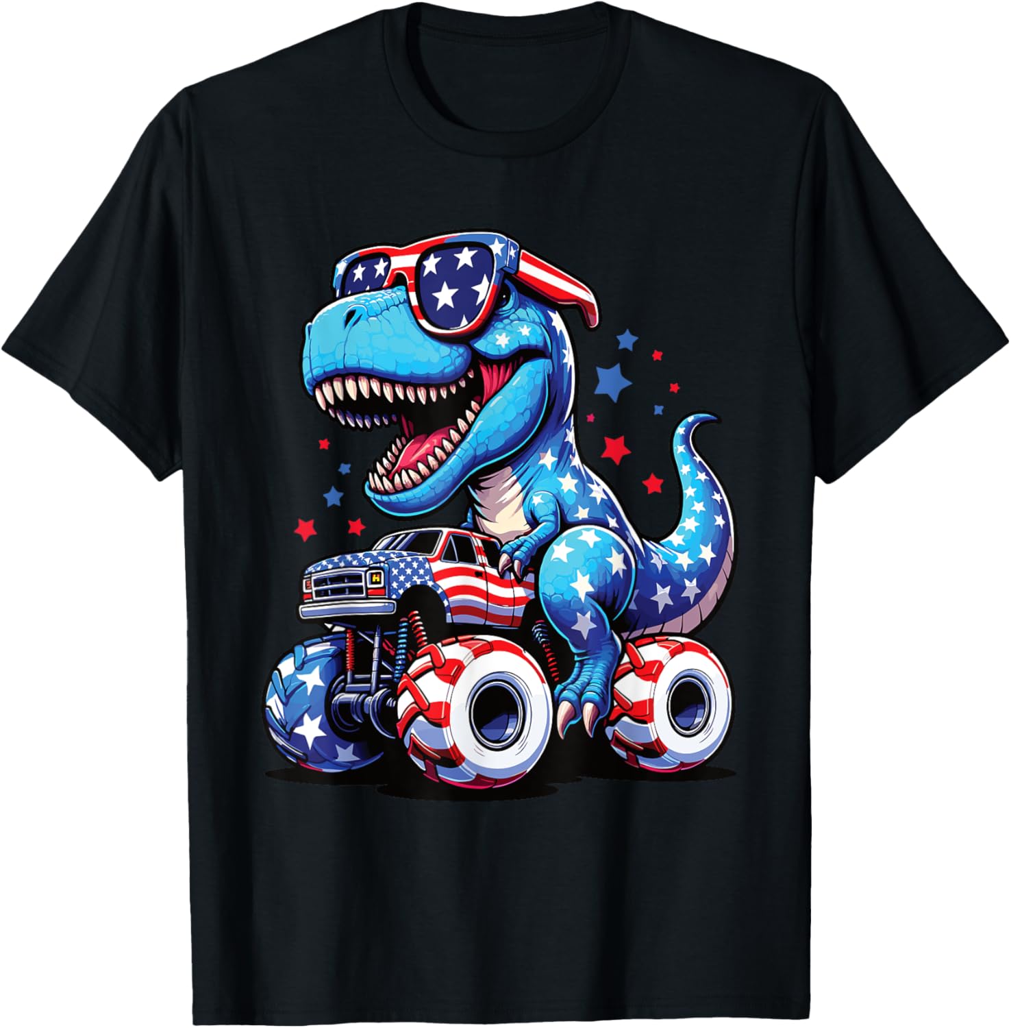 Patriotic T-Rex Riding Monster Truck USA Flag 4th of July T-Shirt