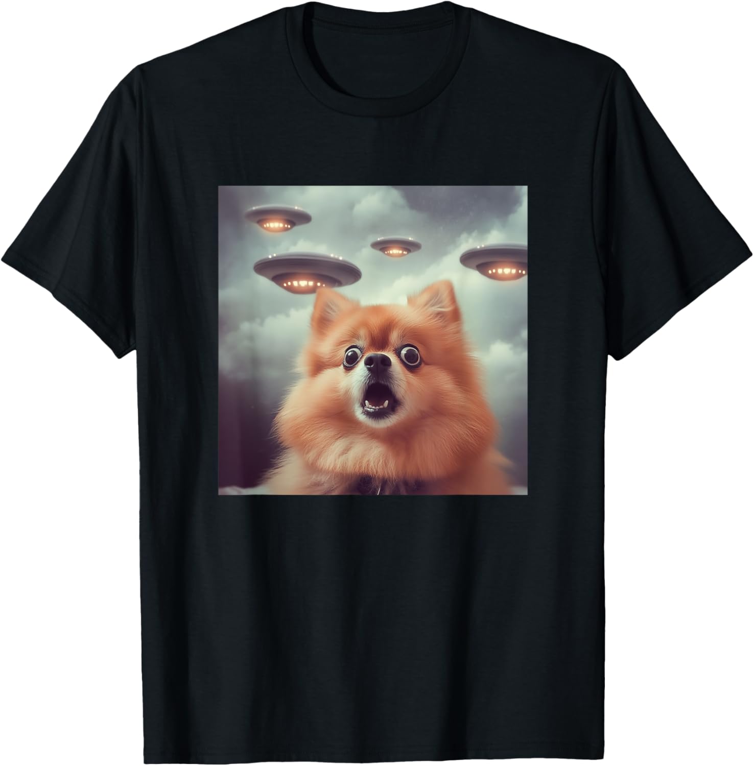 Pomeranian Selfie with UFOs Strange Print Graphic Space Funny T-Shirt