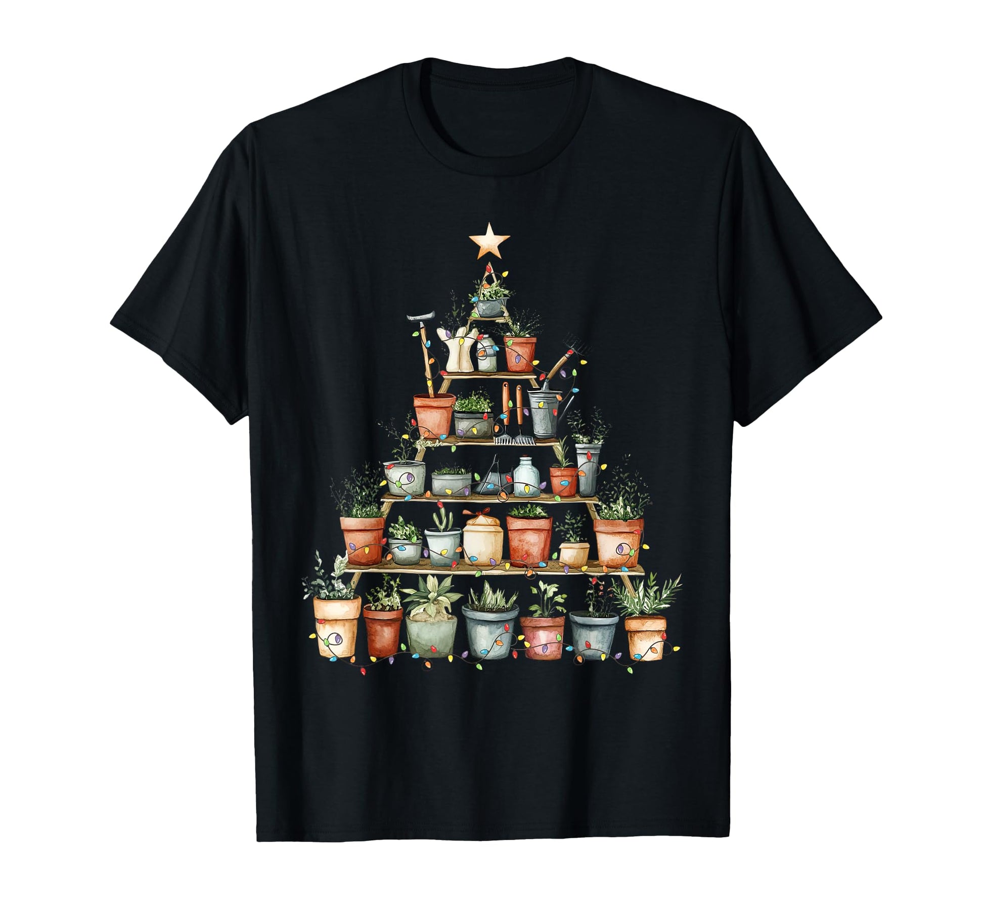 Potted Plant Christmas Tree Lights Gardening Gardener Xmas T-Shirt