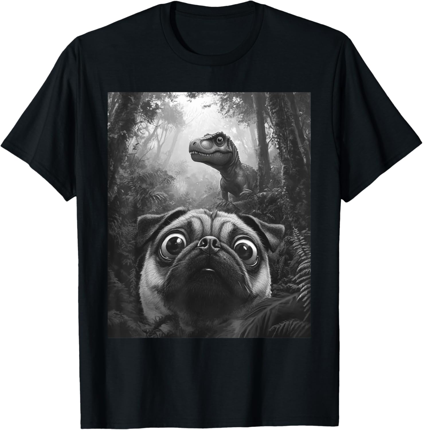 Dog Pug Selfie With T-Rex Dinosaur Funny T-Shirt