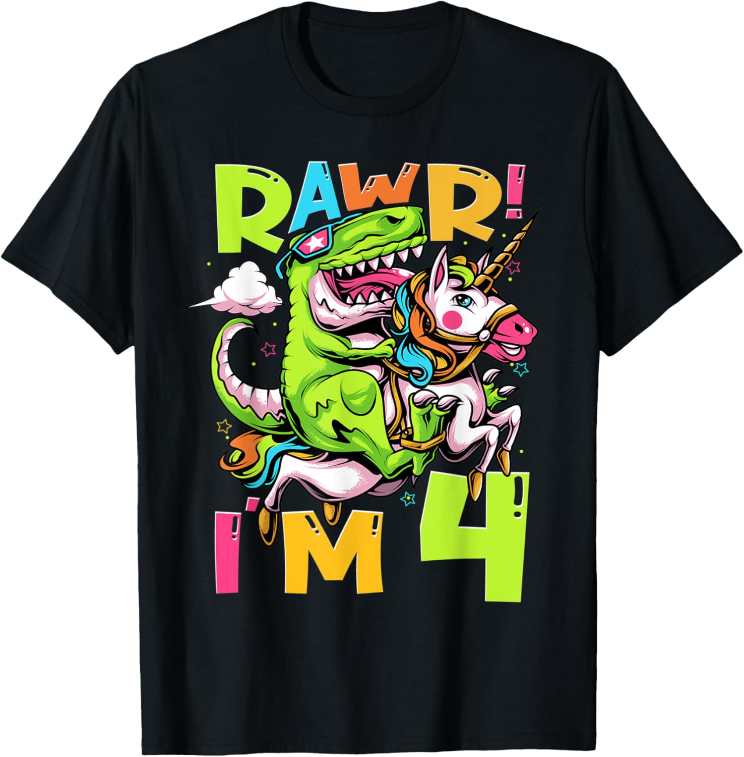 Rawr I'm 4 Kids 4 Years Old 4th Birthday Dinosaur Unicorn T-Shirt