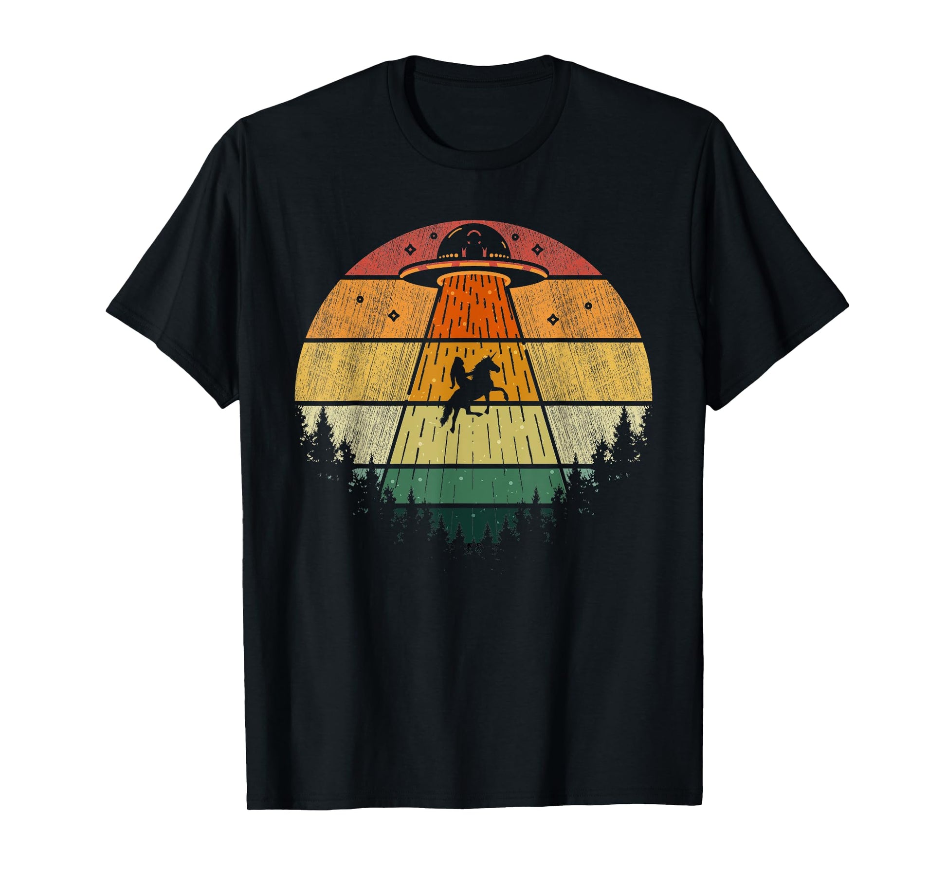Retro Bigfoot Riding Unicorn Funny Sasqutch UFO Abduction T-Shirt