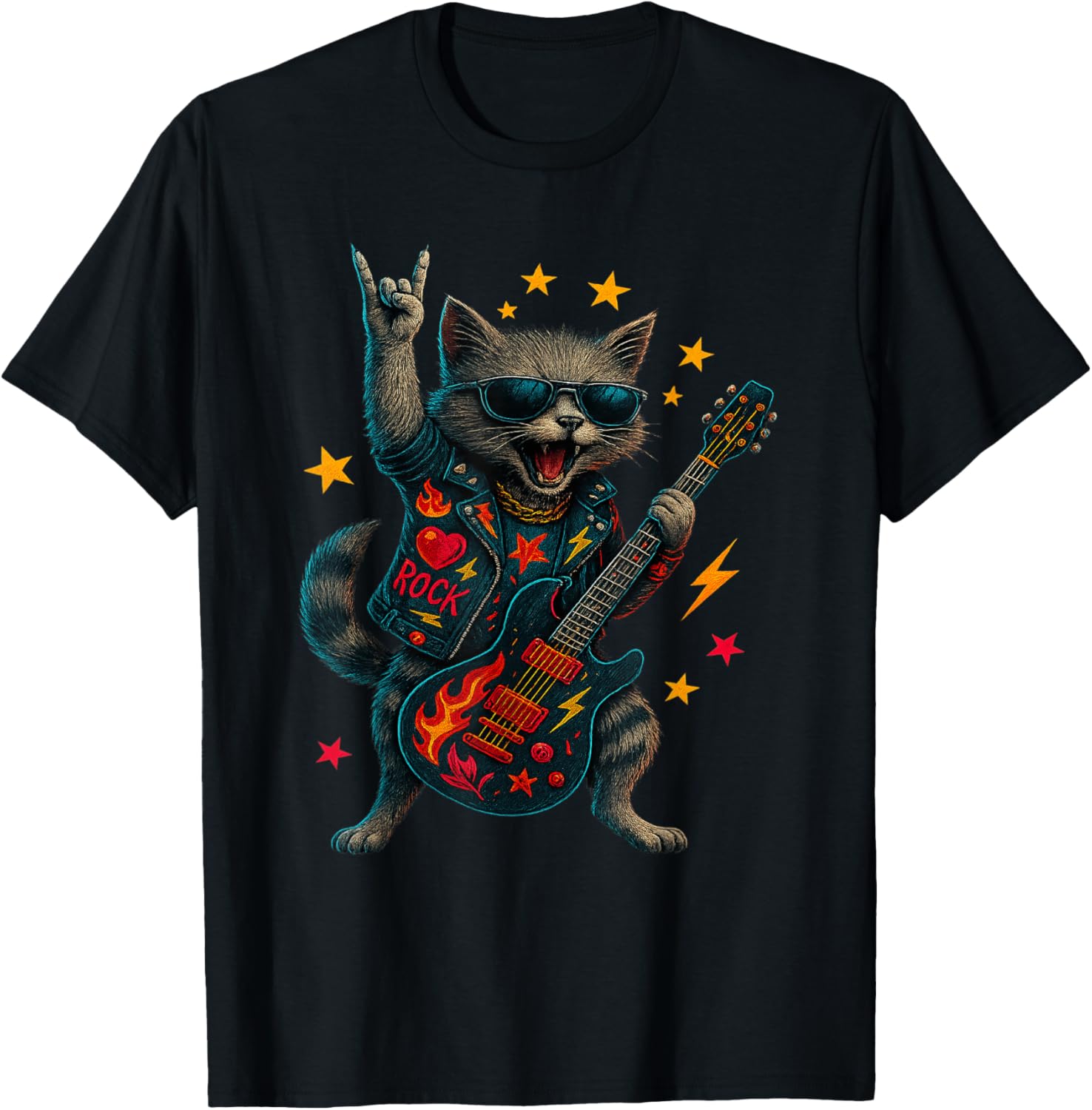 Retro Cat Rock Music Gifts Men Kids Women Funny Cat Guitar T-Shirt