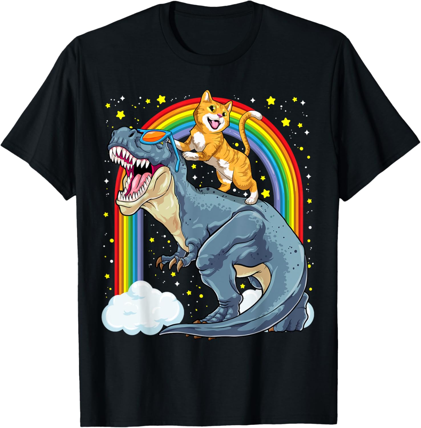 Cat Riding Dinosaur T-Rex Kitten Rainbow Dino Funny T-Shirt