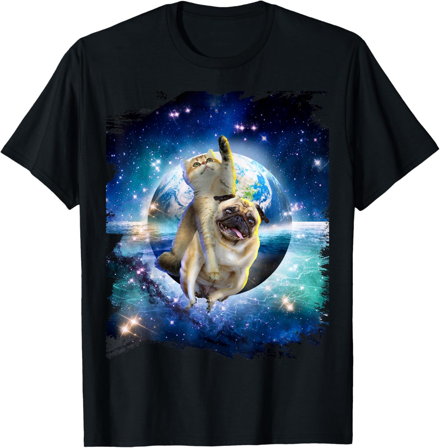 Cat Riding Pug Dog Space Galaxy Earth T-Shirt