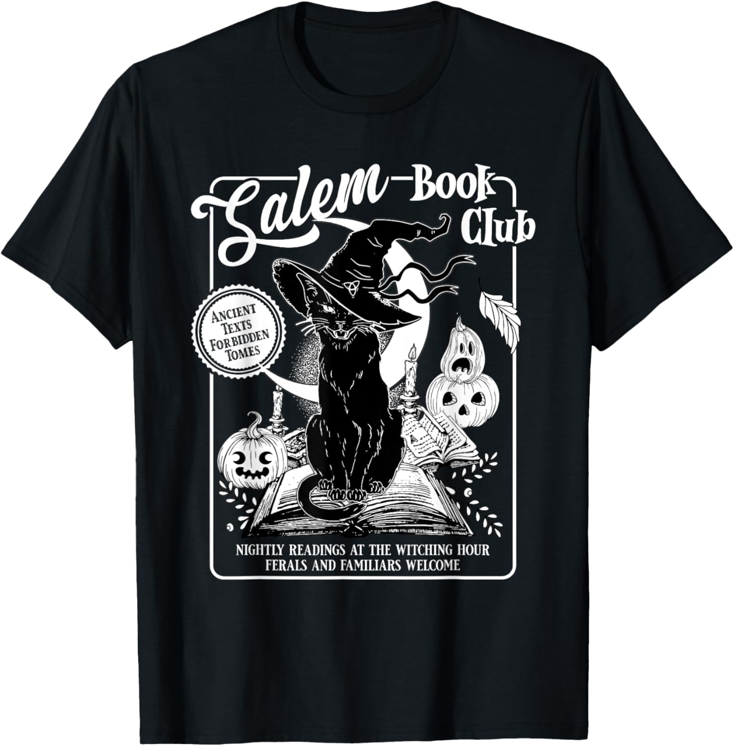 Salem Witch Book Club Bookish Retro Halloween Black Cat T-Shirt