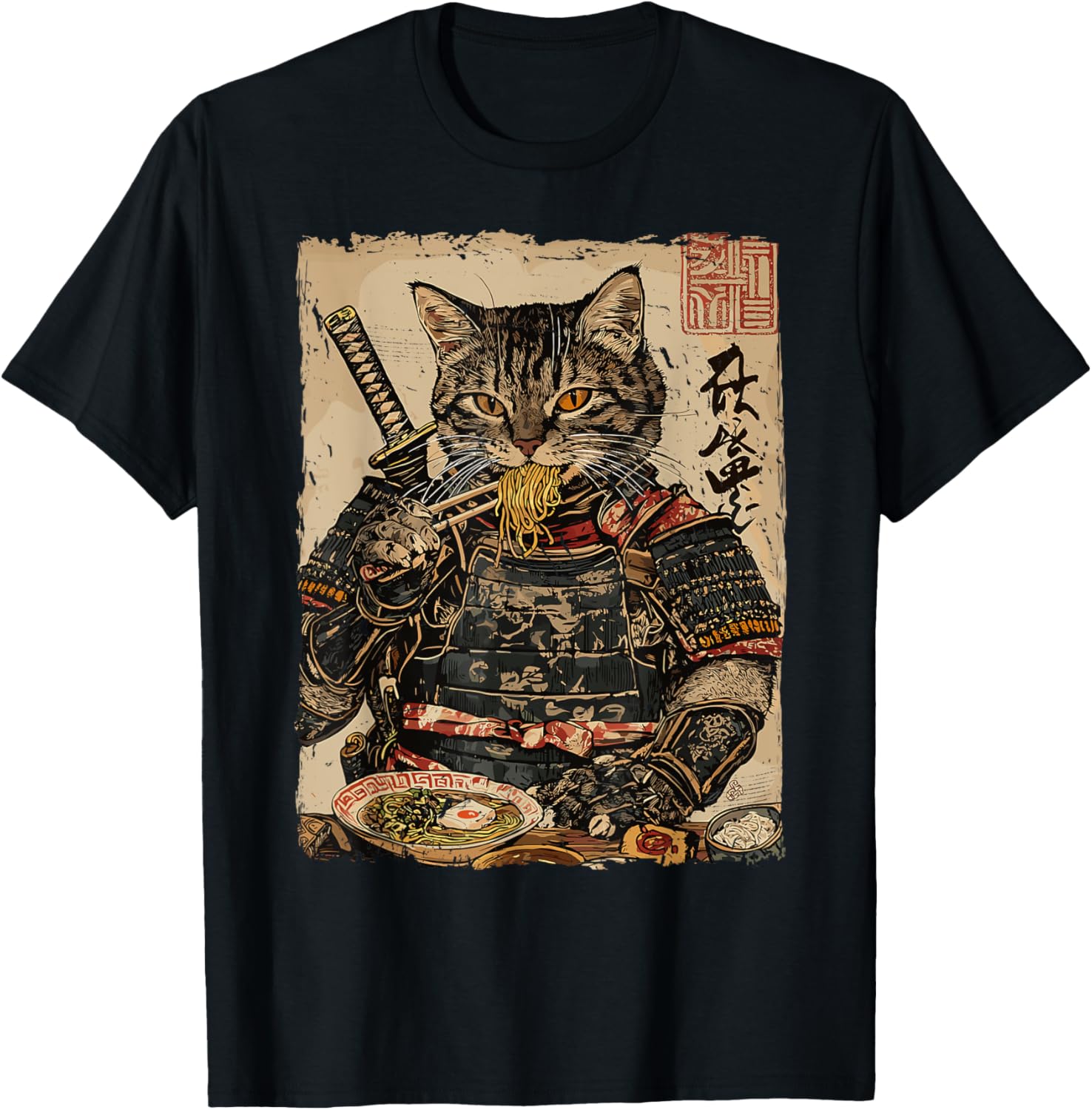 Samurai Cat Loves Ramen Funny Anime Japanese Artwork Samurai T-Shirt