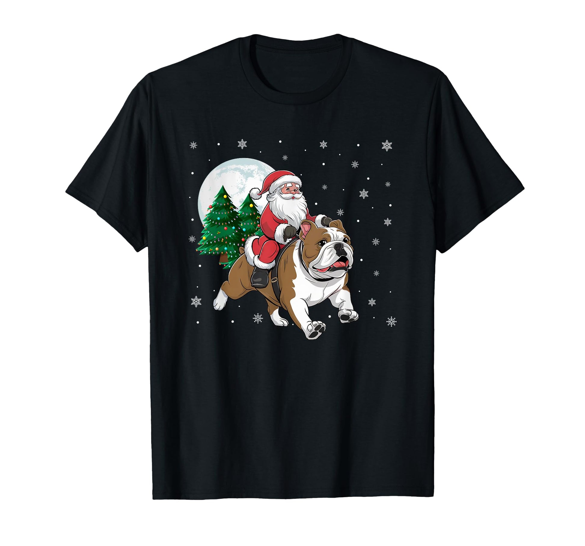Santa Claus Riding English Bulldog Christmas Tree Lights T-Shirt for Men Women Kids