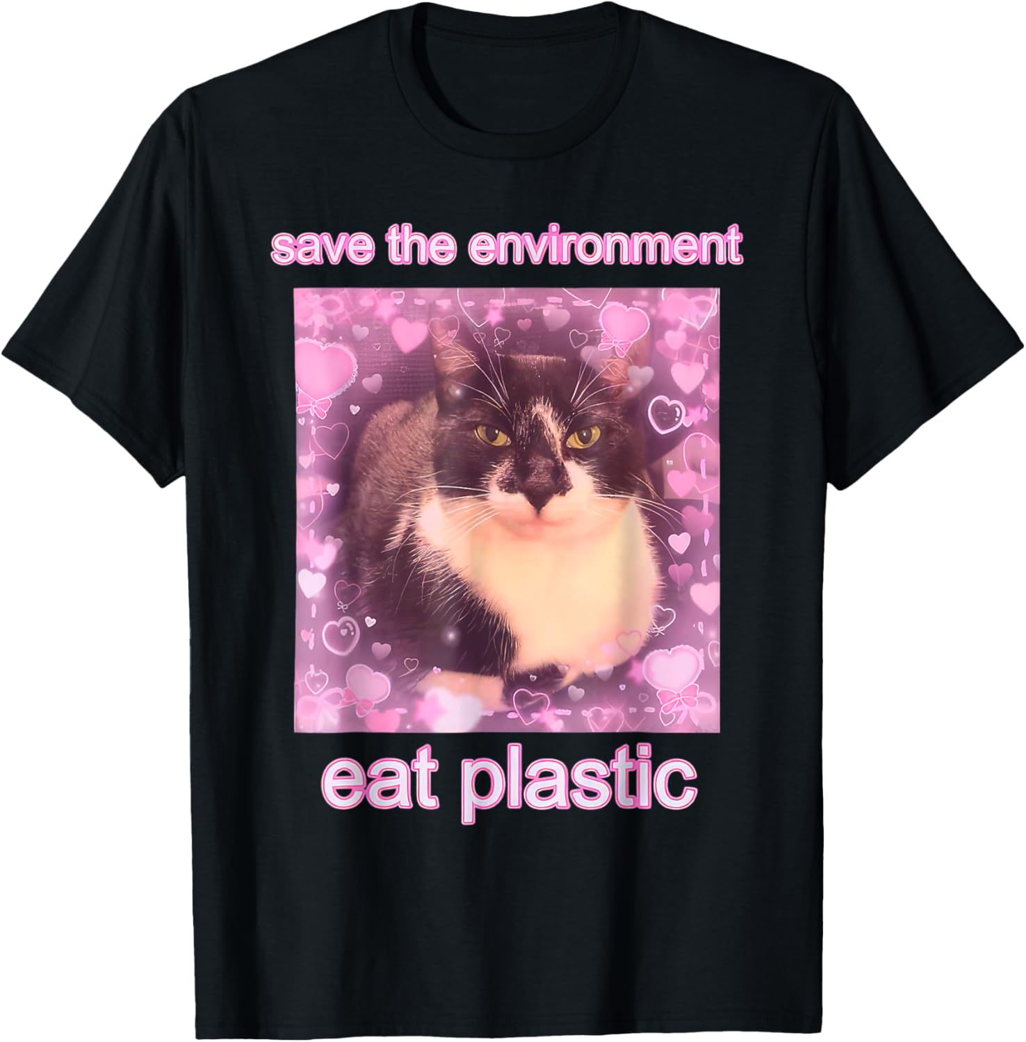 Save The Environment Eat Plastic Funny Cute Cat Meme T-Shirt