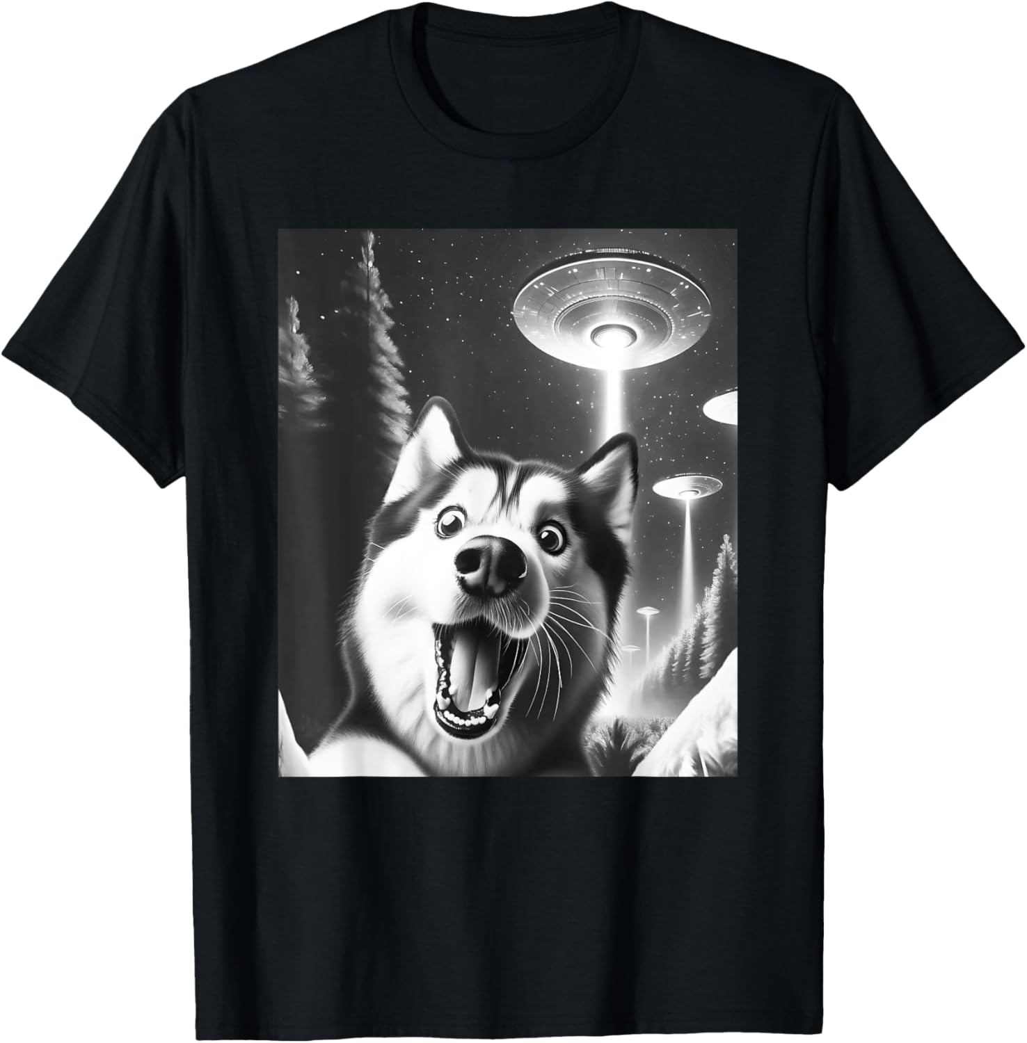 Funny Siberian Husky Alien UFO Taking a Selfie Dog Mom Dad T-Shirt