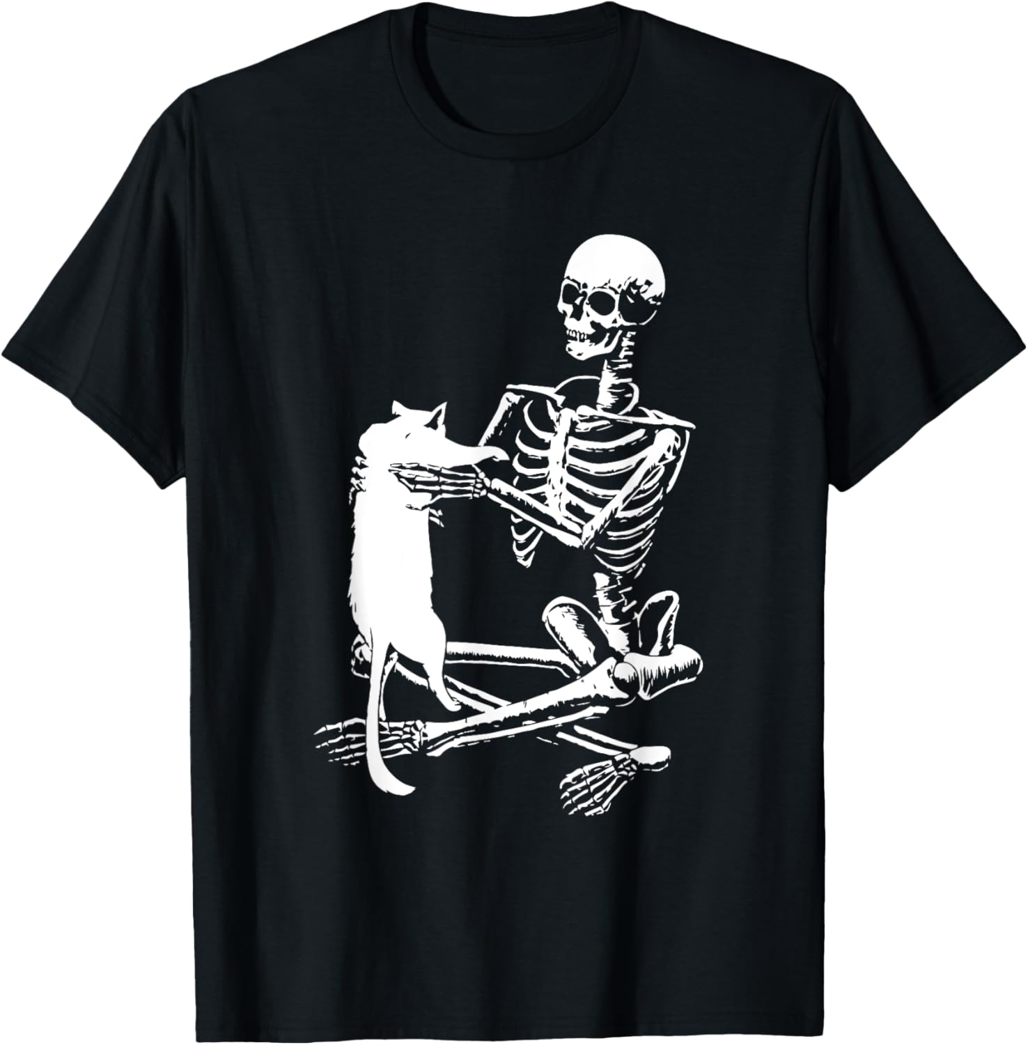 Skeleton Holding A Cat Shirt Lazy Halloween Costume Skull T-Shirt