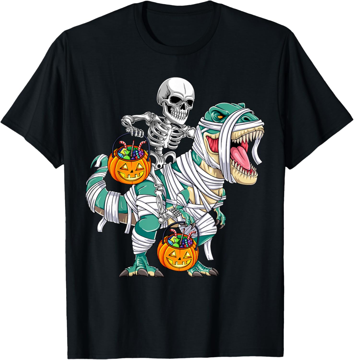 Skeleton Riding Dinosaur T Rex Funny Kids Boys Halloween T-Shirt