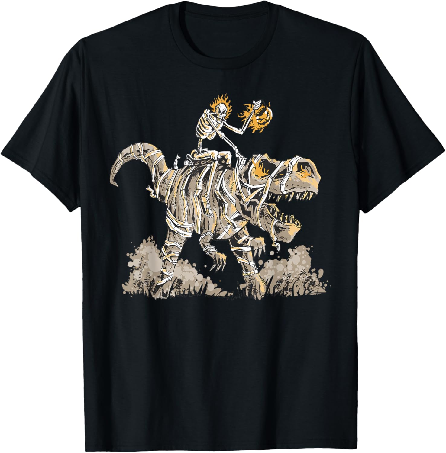 Skeleton Riding Mummy Dinosaur T Rex Pumpkin Funny Halloween T-Shirt