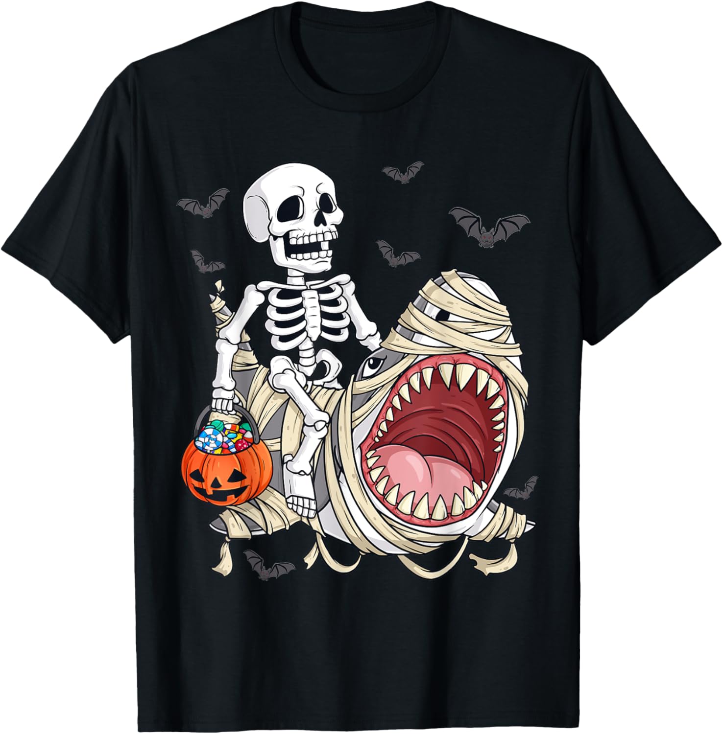 Skeleton Riding Mummy Shark Funny Halloween Pumpkin Kids T-Shirt