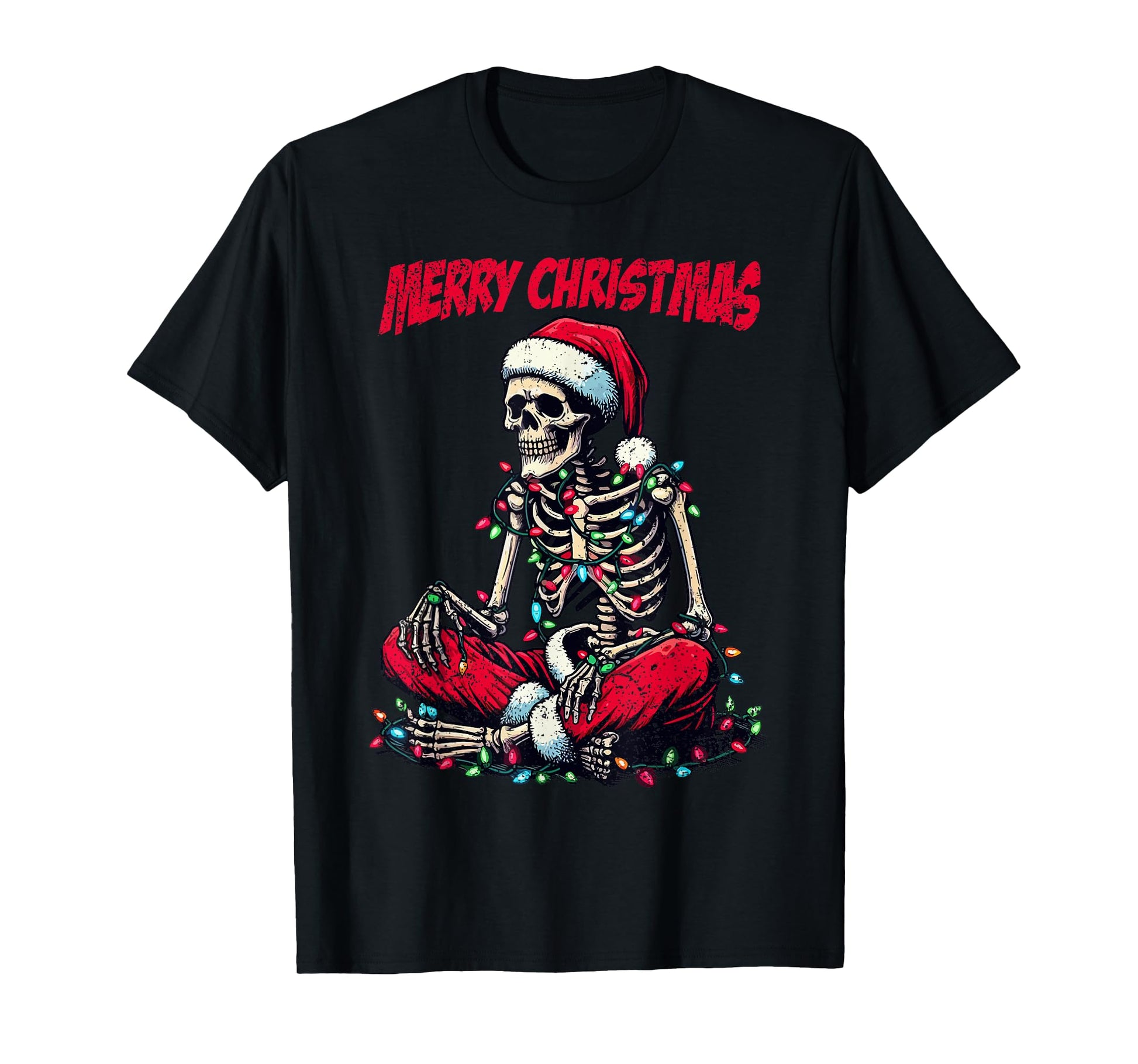 Skeleton Santa Hat Merry Christmas X-mas Lights Holiday T-Shirt