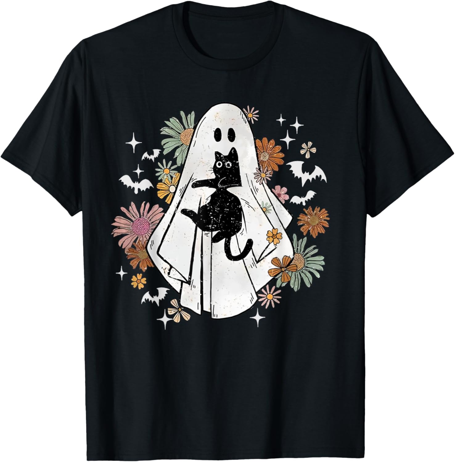Spooky Ghost Holding Black Cat Groovy Floral Halloween Goth T-Shirt