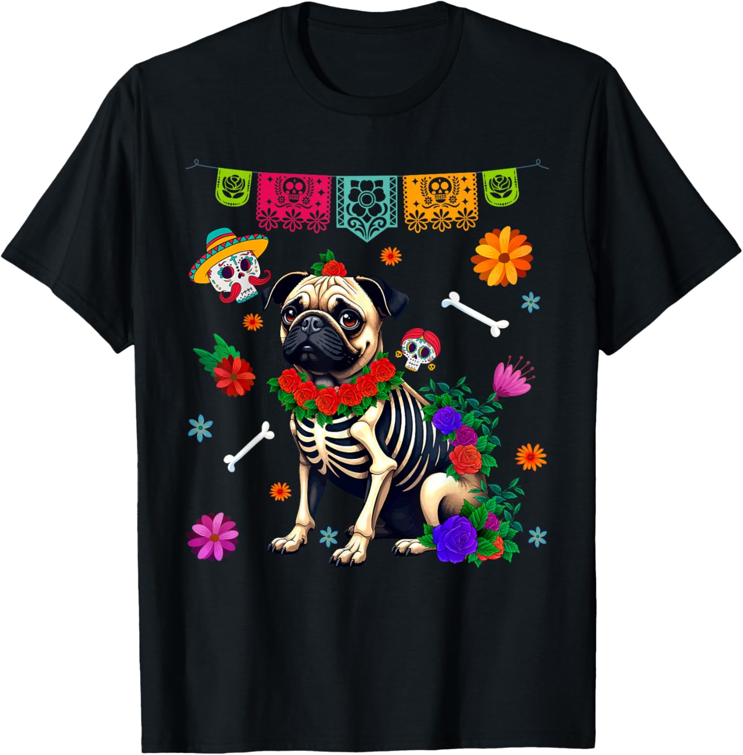 Funny Sugar Skull Pug Dog Flowers Dia de Muertos Halloween T-Shirt