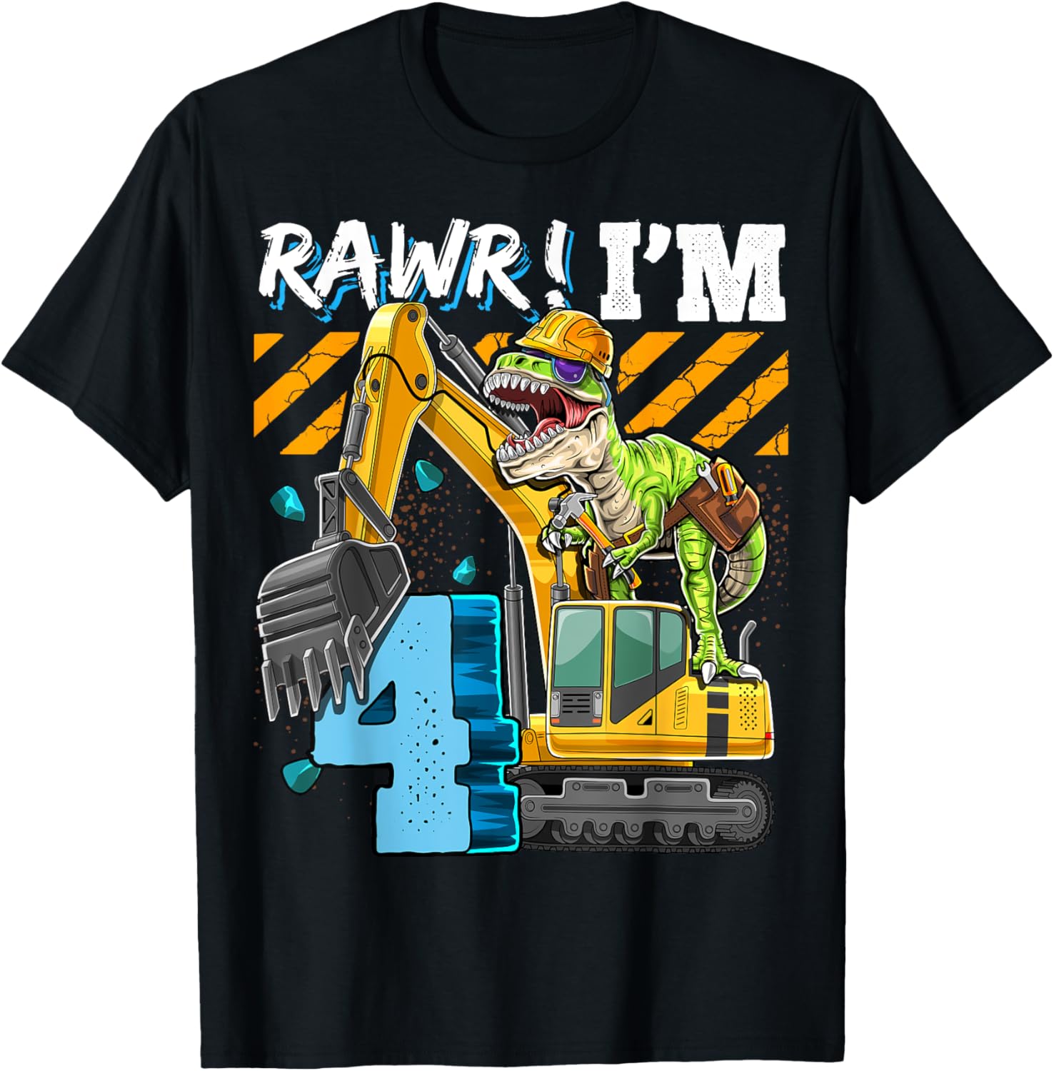 T Rex Dinosaur Construction Hat Excavator 4th Birthday Boys T-Shirt