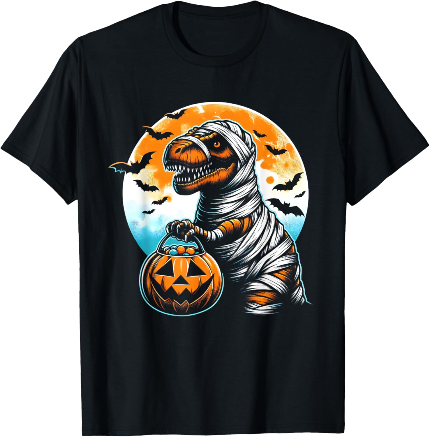 T Rex Dinosaur Mummy Pumpkin Bats Funny Retro Halloween Men T-Shirt