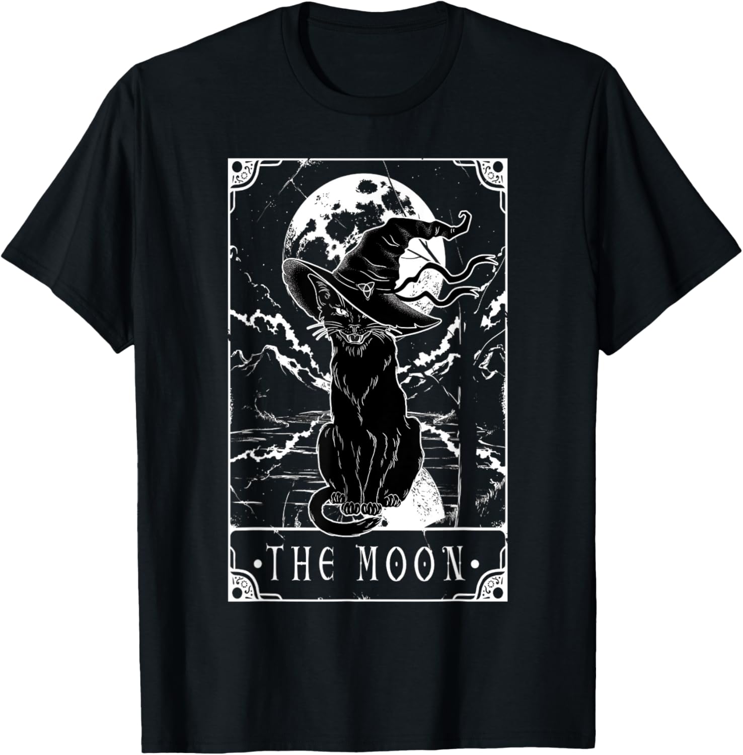 Tarot Card Crescent Moon And Black Cat Witch Hat Halloween T-Shirt
