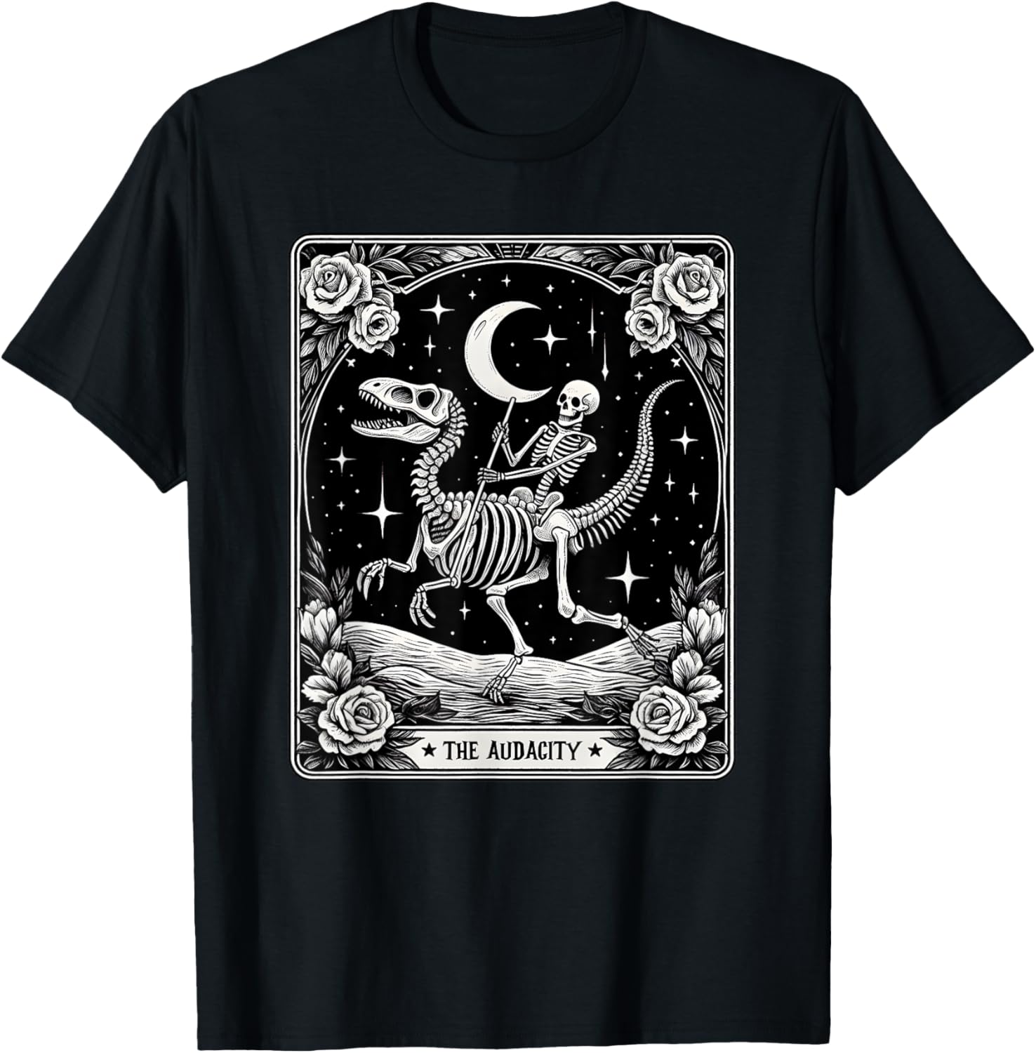 The Audacity Skeleton Riding Dinosaur Tarot Card Halloween T-Shirt
