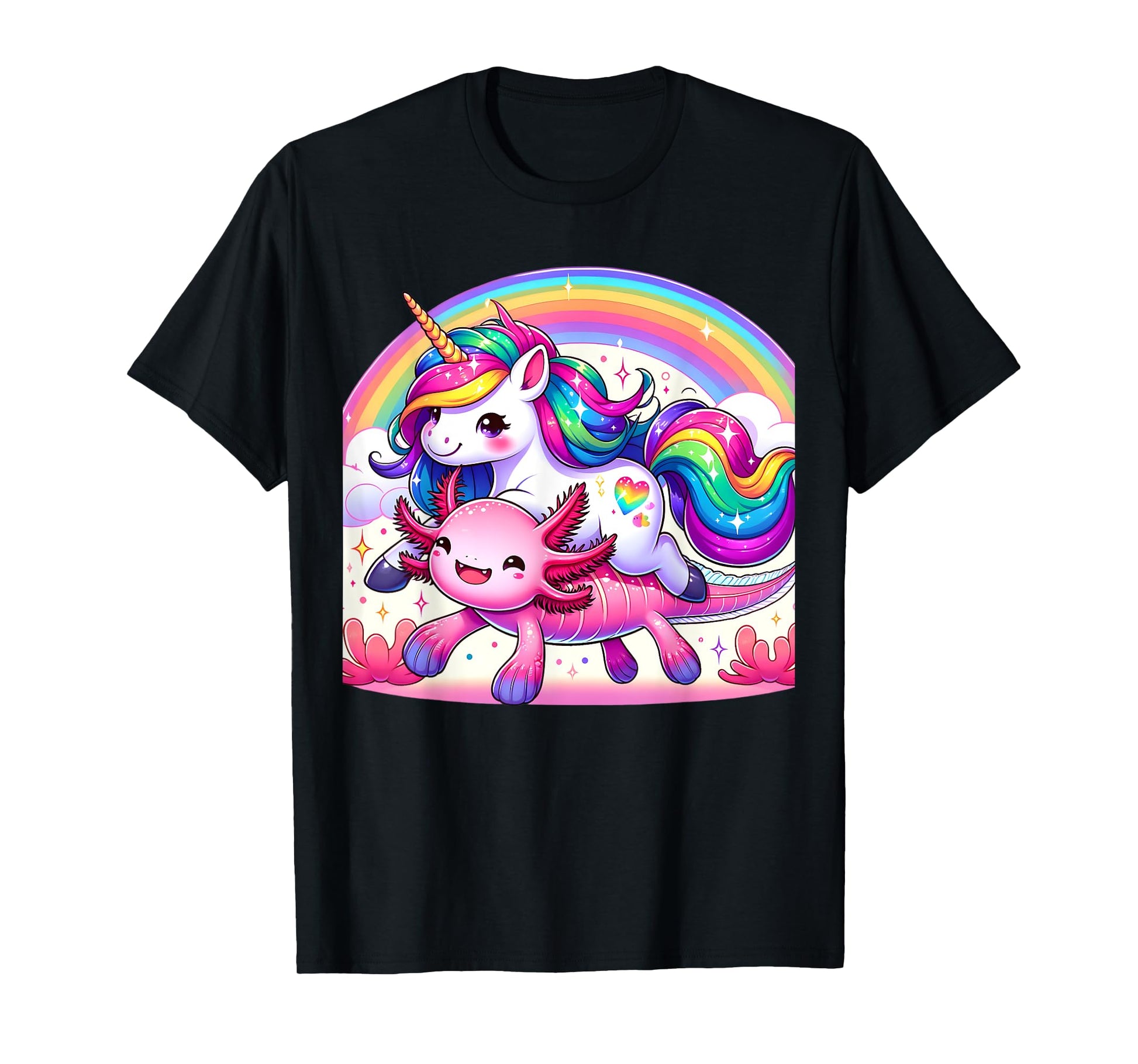 Unicorn Riding Axolotl Kawaii Kids Girls Boys Men Rainbow T-Shirt