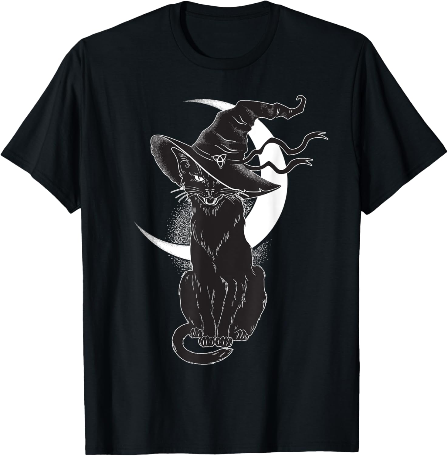 Vintage Scary Halloween Black Cat Costume Witch Hat & Moon T-Shirt